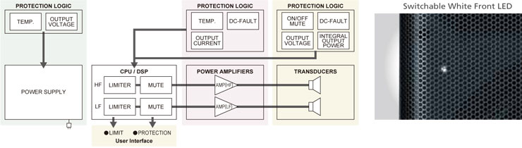 Each of the full-range models and DXS speakers has a white LED behind the front grille that illuminates when powered and varies in brightness depending on the amount of system limiting.